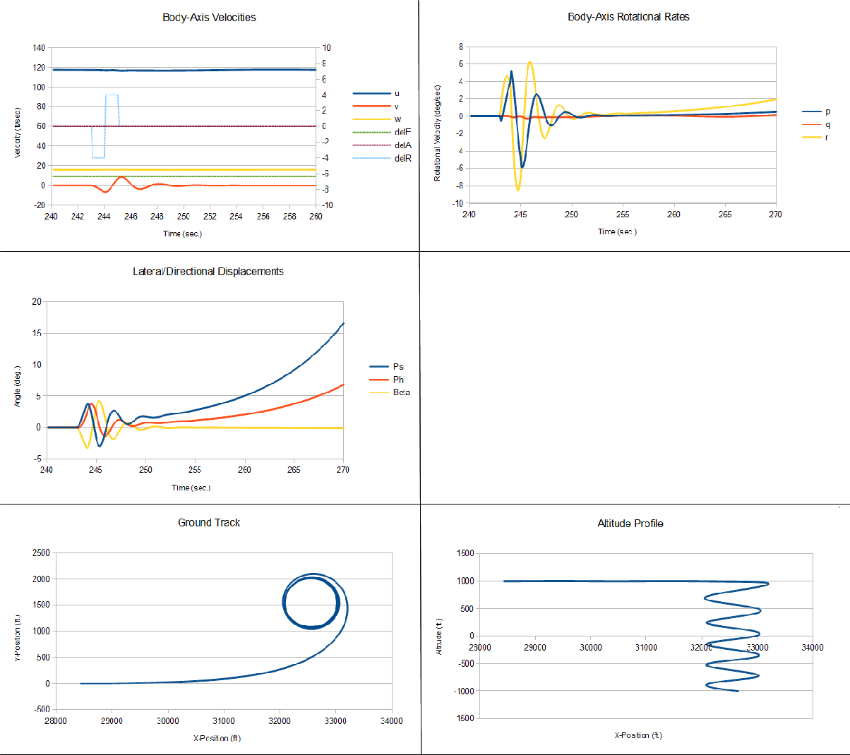 "Body-Axis Velocities" plot, you can see the rudder input and the initial