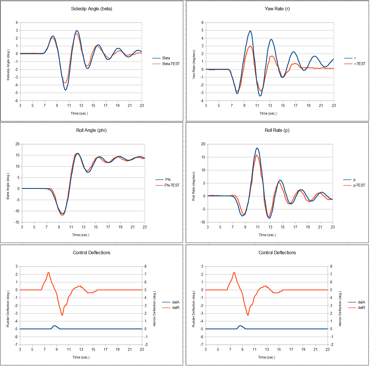 To the right, you can see the results of the rudder doublet. (Click to enlarge.) The column on the left shows the sideslip angle and roll angle responses of the aircraft to the control inputs. The bottom plot shows the measured positions of the real T-45's rudder and ailerons during the maneuver. The red curve is the rudder position and the blue curve is the aileron position. Normally there would be no aileron input during this maneuver, but the pilot accidentally moved the stick sideways while he was kicking the rudder pedals. The red curves in the sideslip and roll plots show the measured responses of the real T-45 to the control inputs. Again, we trimmed the simulated T-45 to the same starting conditions and then fed in the real control inputs. The blue curves show the response of the simulated T-45 to the maneuver. The correlation is exceptional--especially considering the fidelity of the input data. The right-hand column shows the yaw and roll rates of the T-45. These are essentially the first derivatives of the curves in the left-hand column. The control deflection plots are repeated at the bottom of the column for convenience.